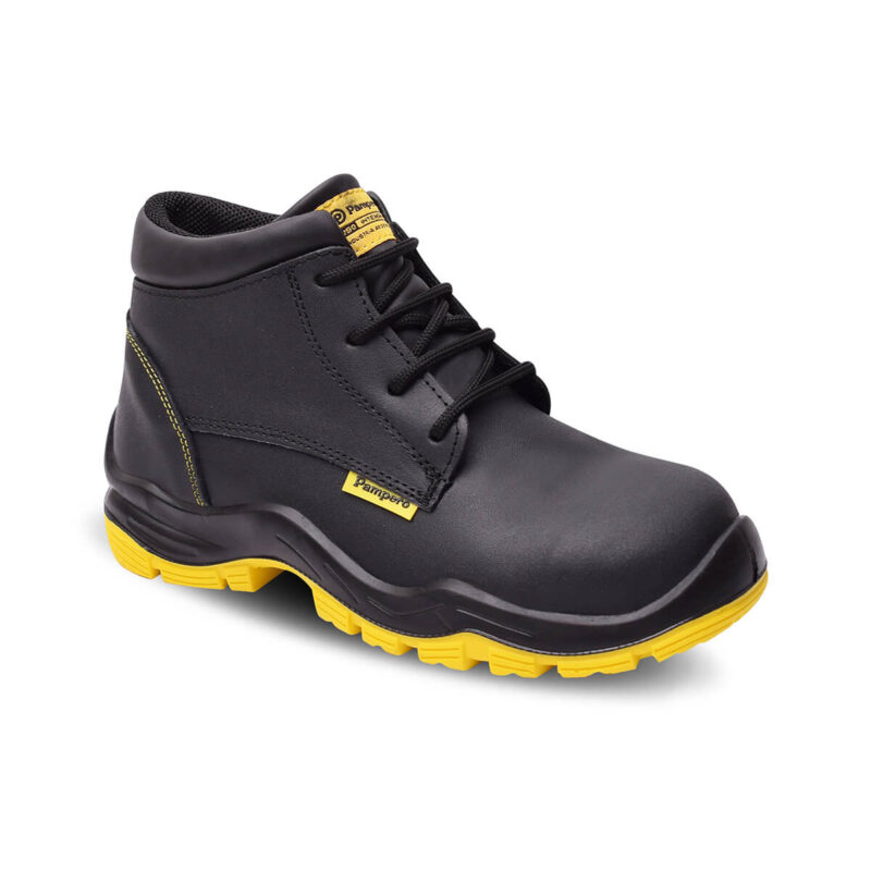 Botín de seguridad fabricado con cuero flor, suela mono-densidad resistente a hidrocarburos, abrasión y dieléctrica. Con puntera de acero que brinda protección certificada contra impactos y plantilla de EVA 4mm con tratamiento antimicótico. Posee ojalillos metálicos con tratamiento anticorrosivo.