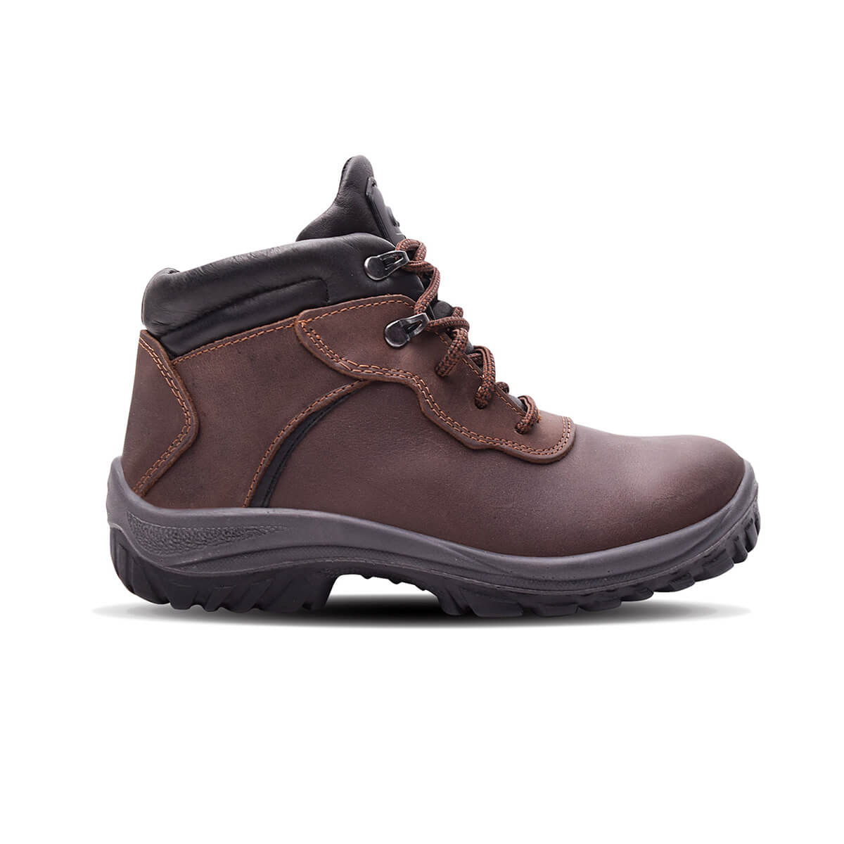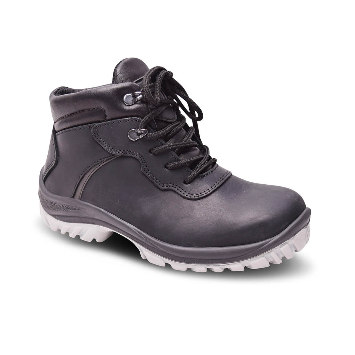 Botín de seguridad fabricado con cuero flor, suela mono-densidad resistente a hidrocarburos, abrasión y dieléctrica. Con puntera de acero que brinda protección certificada contra impactos y plantilla de EVA 4mm con tratamiento antimicótico. Posee ojalillos metálicos con tratamiento anticorrosivo.