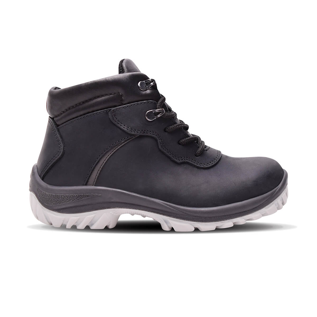 Botín de seguridad fabricado con cuero descarne, suela bi-densidad resistente a hidrocarburos, abrasión y dieléctrica. Con puntera de acero que brinda protección certificada contra impactos y plantilla de EVA 4mm con tratamiento antimicótico.