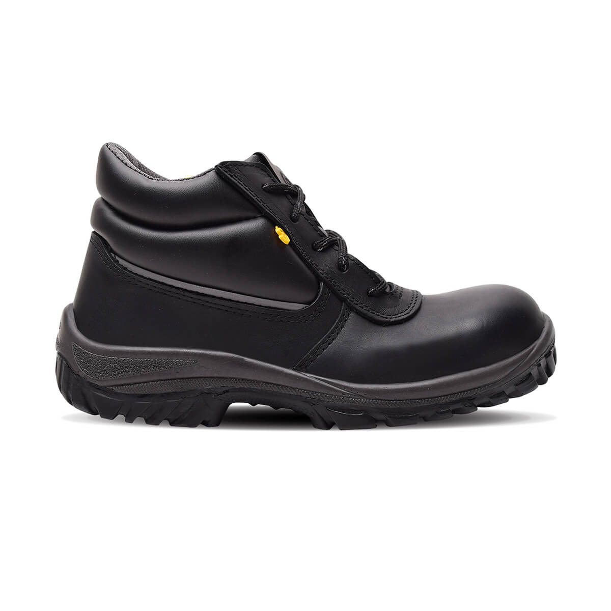 Botín de seguridad fabricado con cuero flor, suela mono-densidad resistente a hidrocarburos, abrasión y dieléctrica. Con puntera de acero que brinda protección certificada contra impactos y plantilla de EVA 4mm con tratamiento antimicótico. Posee ojalillos metálicos con tratamiento anticorrosivo.